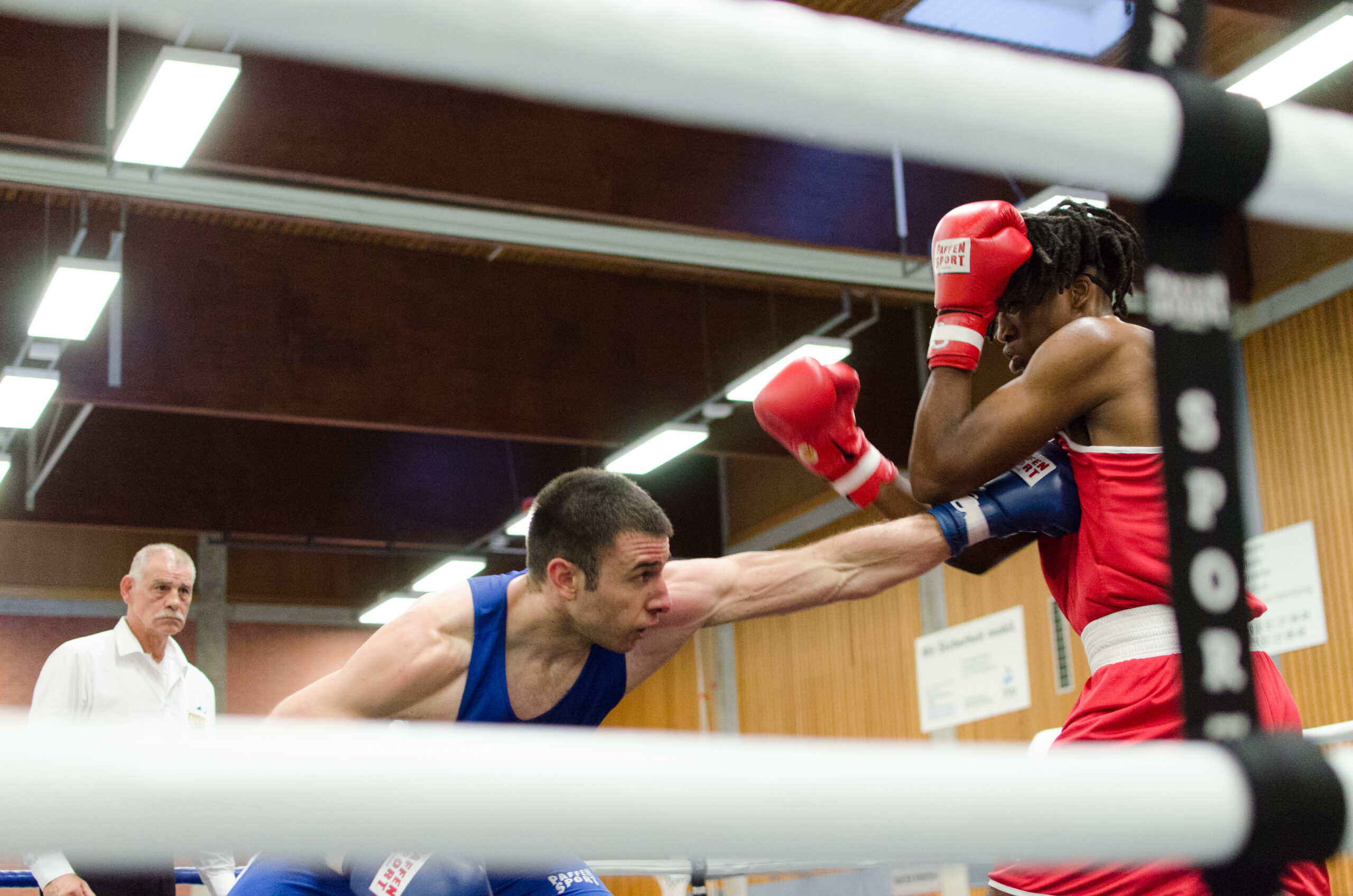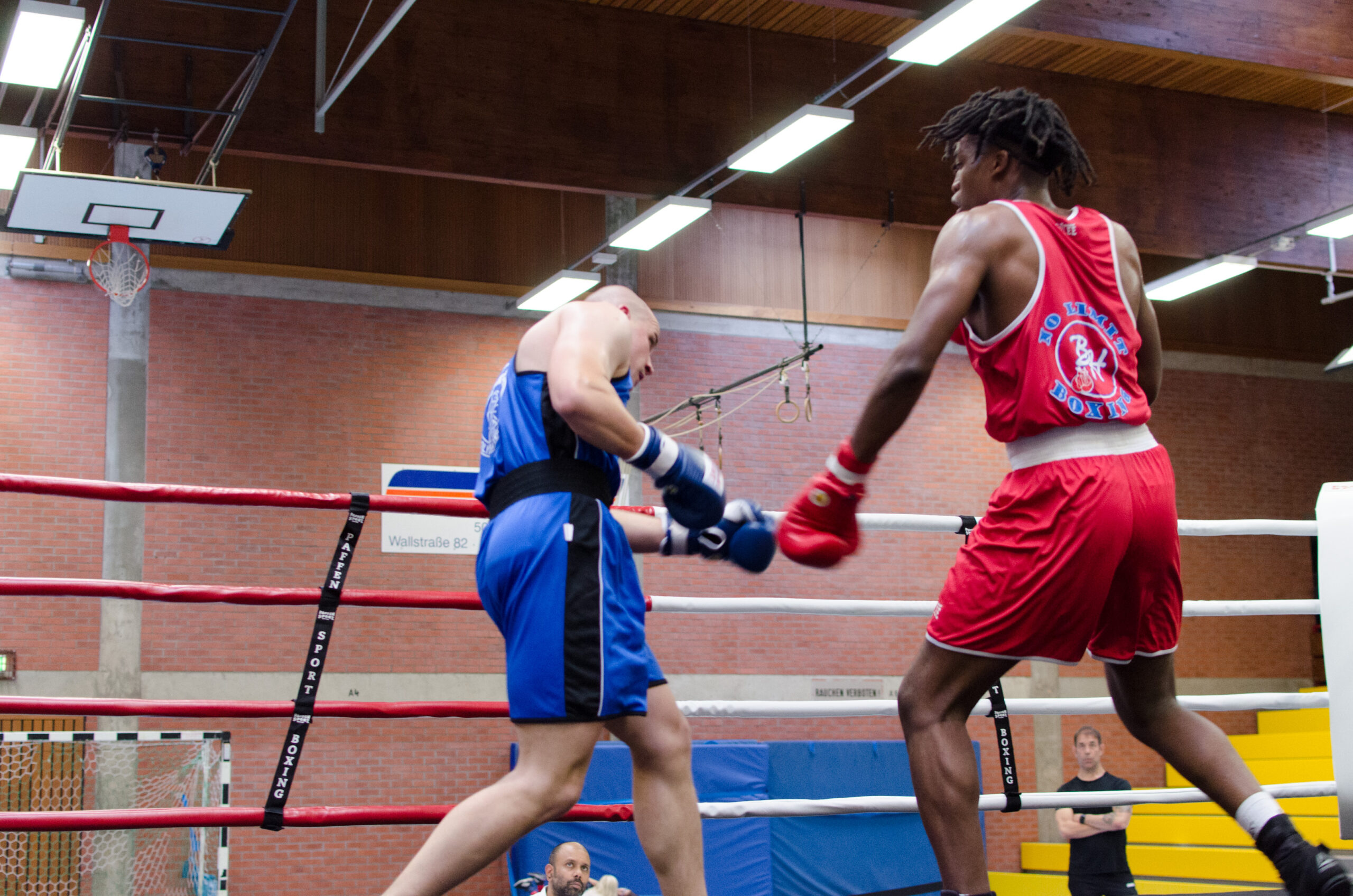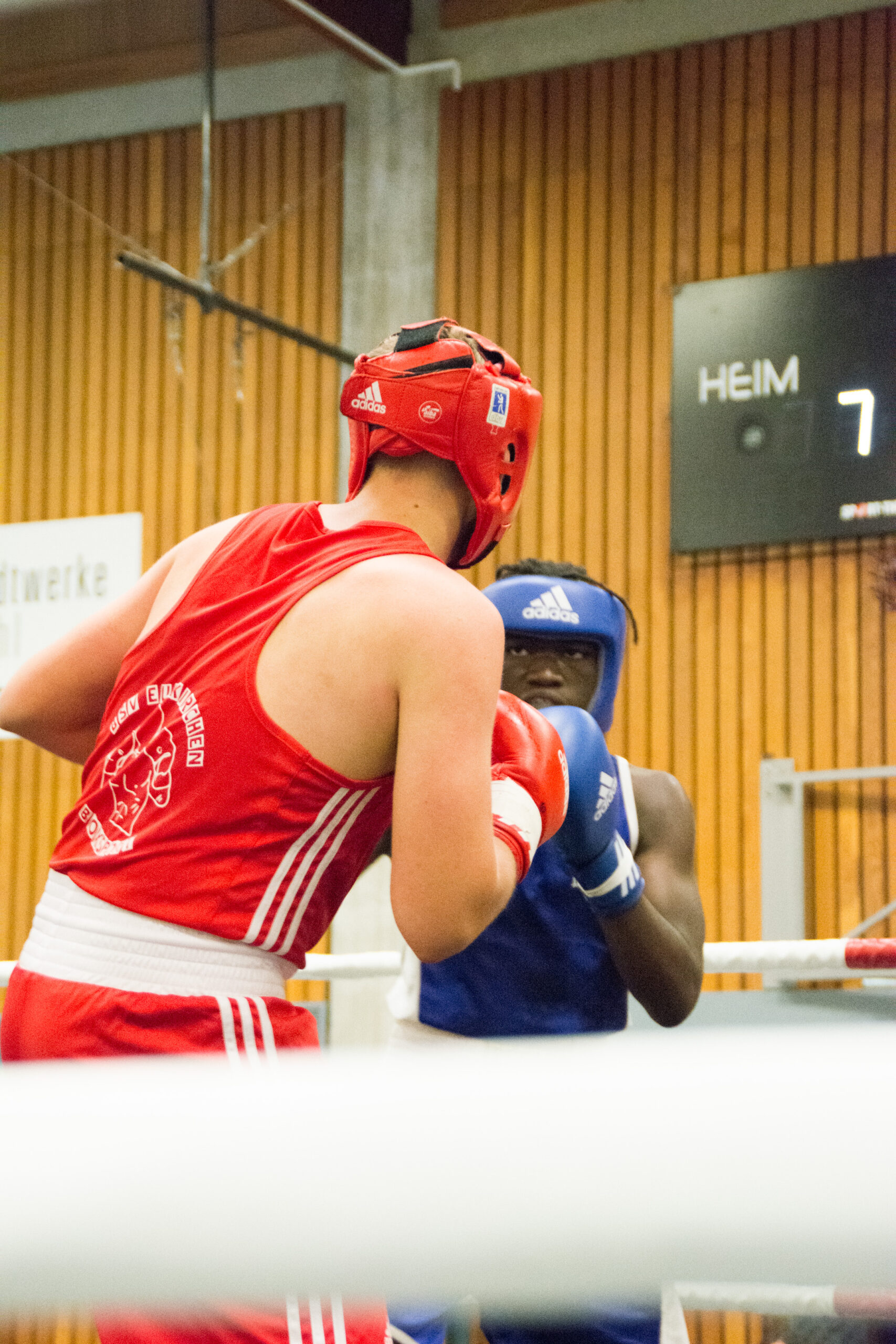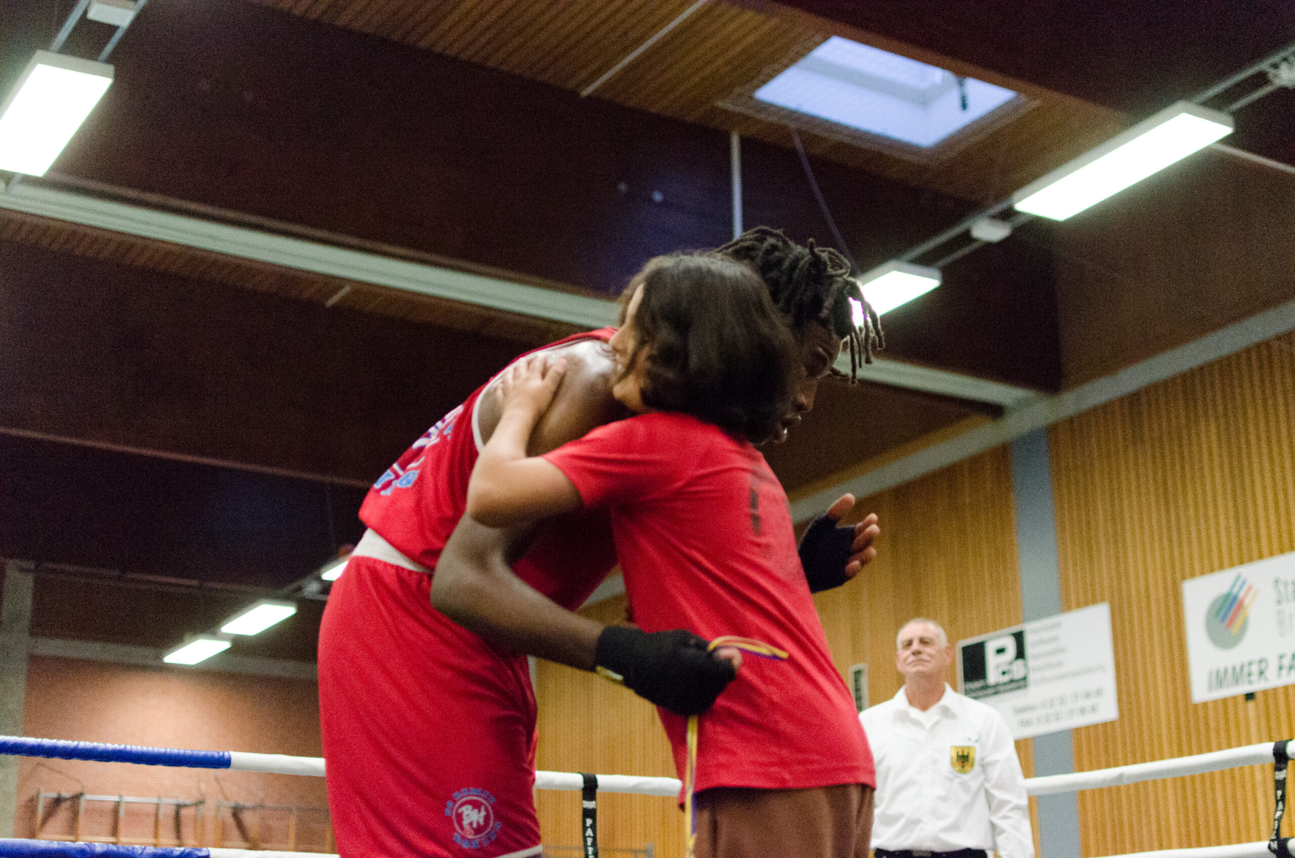 Bei der Finalveranstaltung standen sich dann zwei Kadersportlerinnen des deutschen Boxverbandes gegenüber. Charlotte boxte gegen Joelle Heuer. Diese war einen halben Kopf größer und war schon im Viertel- und Halbfinale durch eine unsaubere Kampfführung aufgefallen. Immer wieder unterband sie das Kampfgeschehen, indem sie sich von oben auf ihre Gegnerinnen lehnte und ihre Arme einklemmte. Das tat sie ebenfalls bei Charlotte. Immer wieder hielt sie ihren Kopf weg, schubste regelrecht und beschwerte sich dann mit Gesten und Blicken beim Unparteiischen im Ring. Auf boxerische Herausforderungen hat man sich Monate und Jahrelang vorbereitet und muss im Ring „nur“ Gelerntes abrufen. Aber an so einem Punkt (wenn permanent unsauber und unsportlich gegen die Regeln agiert wird), zeigen sich die Nerven. Charlotte löste die Situation bestmöglich und versuchte nach ihren Angriffen schnell wieder ausserhalb der Reichweite der Hühnin zu gelangen. Nicht selten schaffte diese jedoch Charlottes Kopf zu schnappen und ihn runter zu drücken oder fest zu halten. Zwei Mal verwarnte der Ringrichter die Boxerin. Im Kampfverlauf traf Charlotte trotzdem immer wieder harte Schlaghände zum Körper der Rechtsauslegerin und schloss ihre Aktionen zum Kopf ab.